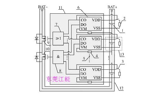 其中:1為單節(jié)鋰離子電池;2為充電過(guò)電壓分流放電支路電阻;3為分流放電支路控制用開關(guān)器件;4為過(guò)流檢測(cè)保護(hù)電阻;5為省略的鋰電池保護(hù)芯片及電路連接部分;6為單節(jié)鋰電池保護(hù)芯片(一般包括充電控制引腳CO,放電控制引腳DO,放電過(guò)電流及短路檢測(cè)引腳VM,電池正端VDD,電池負(fù)端VSS等);7為充電過(guò)電壓保護(hù)信號(hào)經(jīng)光耦隔離后形成并聯(lián)關(guān)系驅(qū)動(dòng)主電路中充電控制用MOS管柵極;8為放電欠電壓、過(guò)流、短路保護(hù)信號(hào)經(jīng)光耦隔離后形成串聯(lián)關(guān)系驅(qū)動(dòng)主電路中放電控制用MOS管柵極;9為充電控制開關(guān)器件;10為放電控制開關(guān)器件;11為控制電路;12為主電路;13為分流放電支路。單節(jié)鋰電池保護(hù)芯片數(shù)目依據(jù)鋰電池組電池?cái)?shù)目確定,串聯(lián)使用,分別對(duì)所對(duì)應(yīng)單節(jié)鋰電池的充放電、過(guò)流、短路狀態(tài)進(jìn)行保護(hù)。該系統(tǒng)在充電保護(hù)的同時(shí),通過(guò)保護(hù)芯片控制分流放電支路開關(guān)器件的通斷實(shí)現(xiàn)均衡充電,該方案有別于傳統(tǒng)的在充電器端實(shí)現(xiàn)均衡充電的做法,降低了鋰電池組充電器設(shè)計(jì)應(yīng)用的成本。