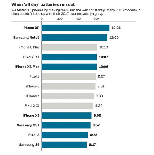 我們也不能一竿子打倒一片,對整個智能手機市場的電池續(xù)航表示過分擔憂。在Fowler的測試中,也有表現不錯的機型,三星的Note9和蘋果的iPhone XR,這兩款手機在設計上各有千秋,在全新的電池技術遲遲未出現的當下,也很好地其他廠商提供了一些延長電池壽命的思路。