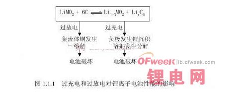 在鋰離子電池的研究開發(fā)中,提高使用安全性問題一直是研究的重點。由于質(zhì)量比能量高,而且電解液大多為有機易燃物等,當電池熱量產(chǎn)生速度大于散熱速度時,就有可能出現(xiàn)安全性問題。有研究指出,鋰離子電池在濫用時,有可能達到700°C以上的高溫,從而導致電池出現(xiàn)冒煙、著火乃至爆炸;在過放電到低于1V時,正極表面將析出銅,造成電池內(nèi)部短路;在過流情況下,電池內(nèi)部溫度也極易升高,使電池性能惡化乃至損壞。圖1.1.1給出了在過充電和過放電情況下,鋰離子電池內(nèi)部的化學反應(yīng)及性能的變化,式中M代表Co、Al、Ni等金屬離子。